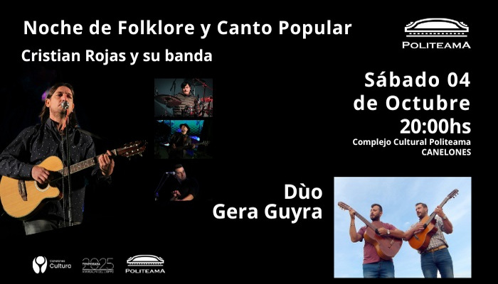 Cristian Rojas y su banda, Dúo Jera Guyra. Artistas canarios con amplia trayectoria, presentando un espectáculo de Folklore y canto popular. Recorriendo muchos escenarios del país, llegamos al Teatro Politeama con la idea de presentarnos y brindar nuestro trabajo con mucha alegría.
