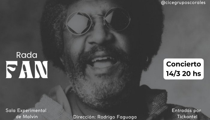 Espectáculo: RADA FAN Un homenaje coral a la leyenda del Candombe-Beat «Rada FAN» es la nueva y ambiciosa apuesta de CICE Grupos Corales, bajo la dirección general de Rodrigo Faguaga. Este proyecto puntual se presenta no solo como un tributo a la inabarcable trayectoria de Ruben Rada, sino como una experiencia sonora expansiva que fusiona la potencia del canto coral con la raíz rítmica de los tambores. El espectáculo propone una inmersión en el universo musical de Rada a través de versiones corales inéditas, integrando una plantilla de 24 coreutas (6 por cuerda) y un bloque de percusión fundamental. La propuesta destaca por su metodología de estudio intensivo, donde los integrantes asumen el compromiso de un aprendizaje individual previo para transformar los ensayos en espacios de ensamble puro, puesta en escena y excelencia interpretativa.