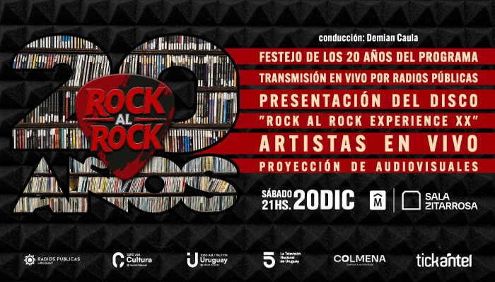 Festejo por los 20 años de programa. Presentación del disco «Rock al Rock Experience XX» Festejo por el «Premio Morosoli Institucional 2024» a trayectoria radial. Lanzamiento del nuevo proyecto audiovisual Rock al Rock TV. Transmisión radial en vivo por los Medios Públicos Radio Cultura 1290 AM Radio Uruguay 1050 AM / 94.7 FM www.mediospublicos.uy